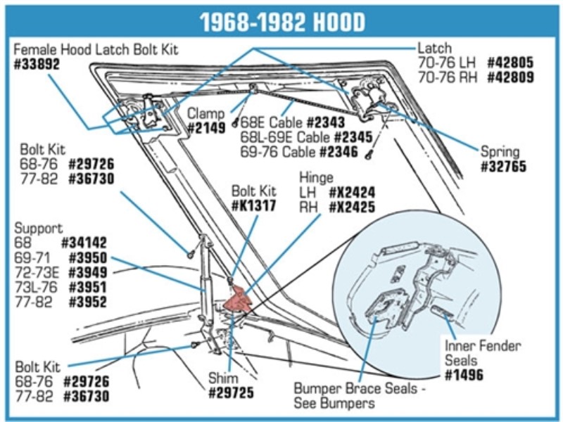 Female Hood Latch Bolt Kit. 9 Piece 68-76