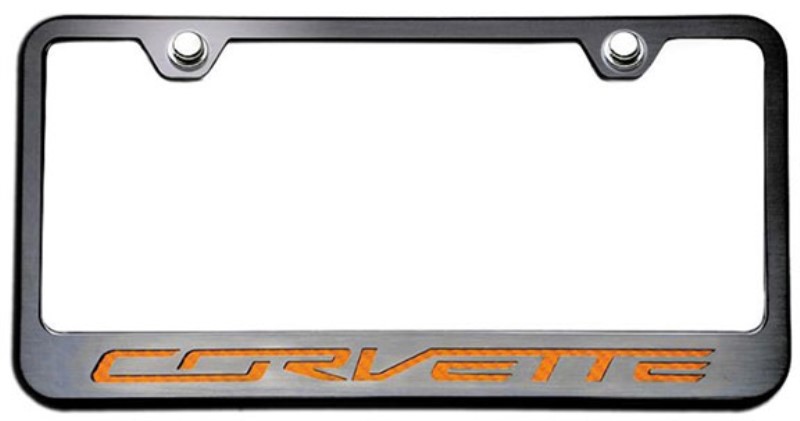 Rear Tag Frame - Powder Coat Black With Stainless Steel -Corvette- Lettering - Orange Carbon Fiber