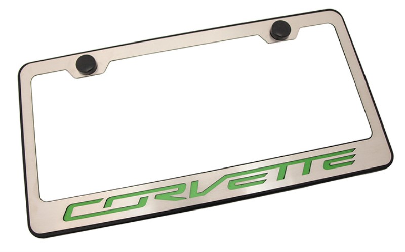 Rear Tag Frame - Powder Coat Black With Stainless Steel -Corvette- Lettering - Sublime Green